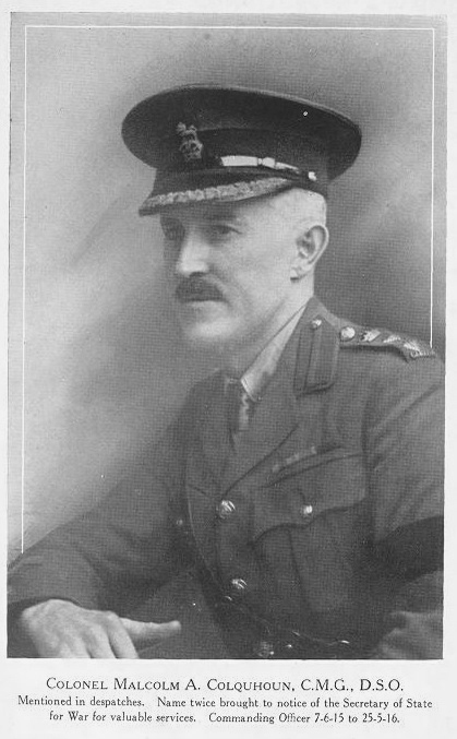 Colquhoun remained in command of the 4th Battalion for a year. He received the Distinguished Service Order and was granted furlough to Canada in June 1916. On his return to Brantford, he was welcomed home as a war hero and aided recruitment efforts for the 125th and 215th Battalions.