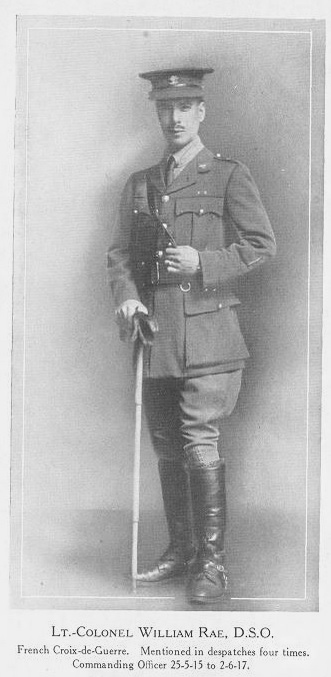 A native of Scotland, William Rae was born on 15 January 1883 in Aberdeen. He immigrated to Canada in 1907, moved to British Columbia and joined the 72nd Seaforth Highlanders Regiment. At the outbreak of the Great War, the five-foot-six Scotsman enlisted with the 16th Battalion. Rae fought at Second Ypres during the German gas attack and was the only company commander in the 16th to survive the battle. By June 1916, he had transferred to the 4th Battalion in order to take command from Lieutenant Colonel Malcolm Colquhoun.
