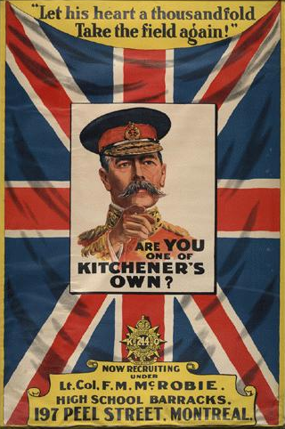On 5 June 1916, while transporting British War Minister, Field Marshal Horatio Herbert Kitchener, on a diplomatic mission to Russia, the HMS Hampshire struck a German mine near the Orkney Islands. Earl Kitchener and his staff drowned in the violent sea along with 643 crew and passengers. One day later, the 244th Battalion was authorized from Montreal under the command of Frederick Mackenzie McRobie. Sir Sam Hughes dubbed the new unit Kitchener’s Own and called on recruits to avenge the War Minister’s death.